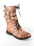 Distressed leatherette lace-up combat boot with strappy bootstrap detail. Inside zipper closure. Heel height: 1 inches. Women's whole & half sizes. All Man Made Material. Imported.