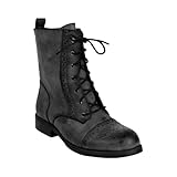 A classic distressed lace up bootie updated with distinctive perforated brogue detail. Approx. boot shaft height: 7 1/2"; 11" calf circumference; 1 1/2" heel. Material: Man Made (PU). Size Runs: True to size. Style Name: Lug13.(SKU: LUG-13-BLK-PU)