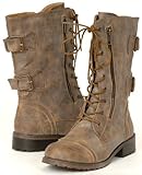 These tough combat inspired lace up boots boost up your courage when you face to face with your biggest fashion enemy! Stylish rustic distressed style. Fashioned with metallic zipper embellishment and double decorative buckle straps in the back shaft. Round toe, low heel, smooth lining and padded insole. Side zipper closure.Heel: 1"(0.5" Platform)